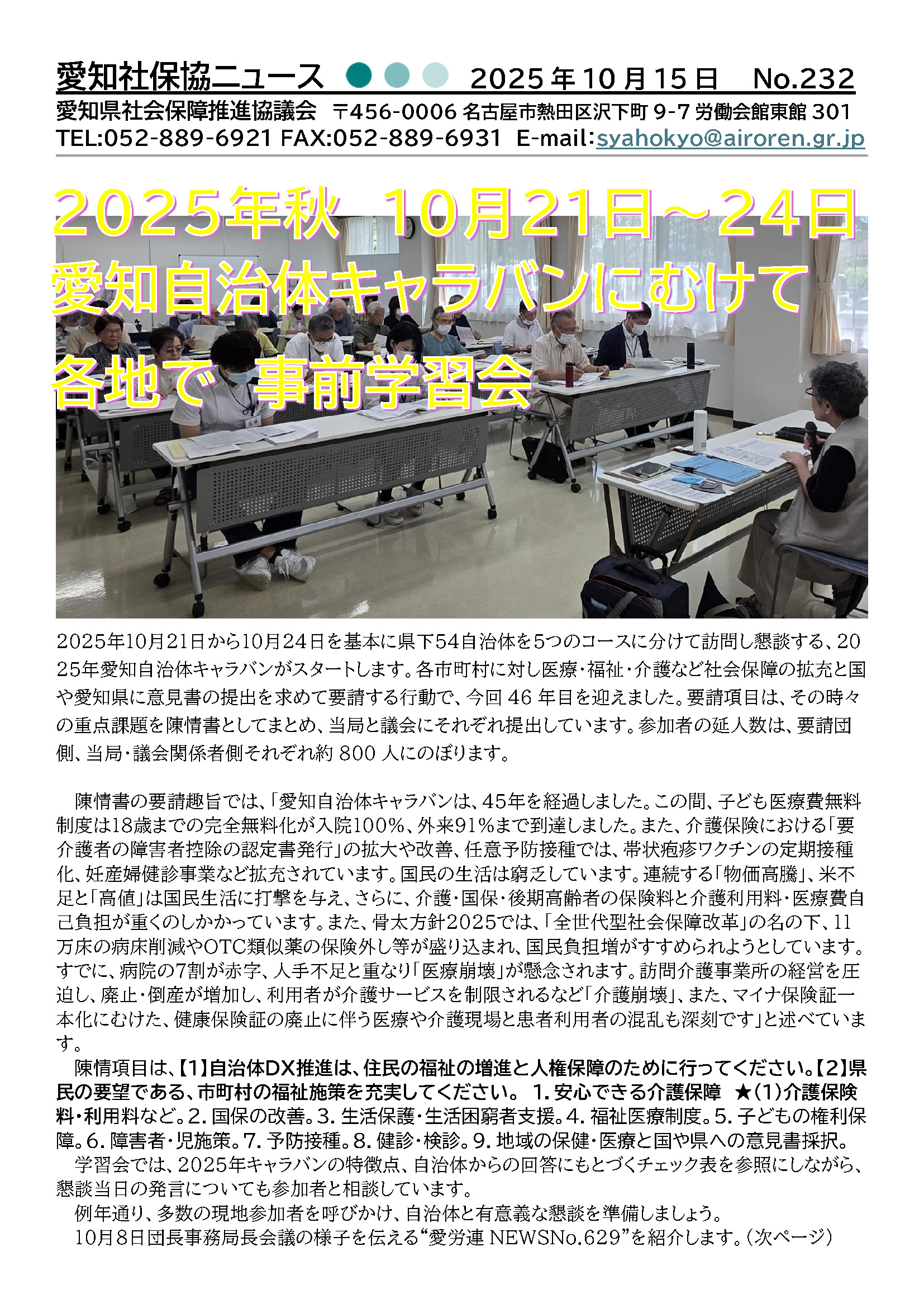 2025年10月21日から10月24日を基本に県下54自治体を5つのコースに分けて訪問し懇談する、2025年愛知自治体キャラバンがスタートします。各市町村に対し医療・福祉・介護など社会保障の拡充と国や愛知県に意見書の提出を求めて要請する行動で、今回46年目を迎えました。
